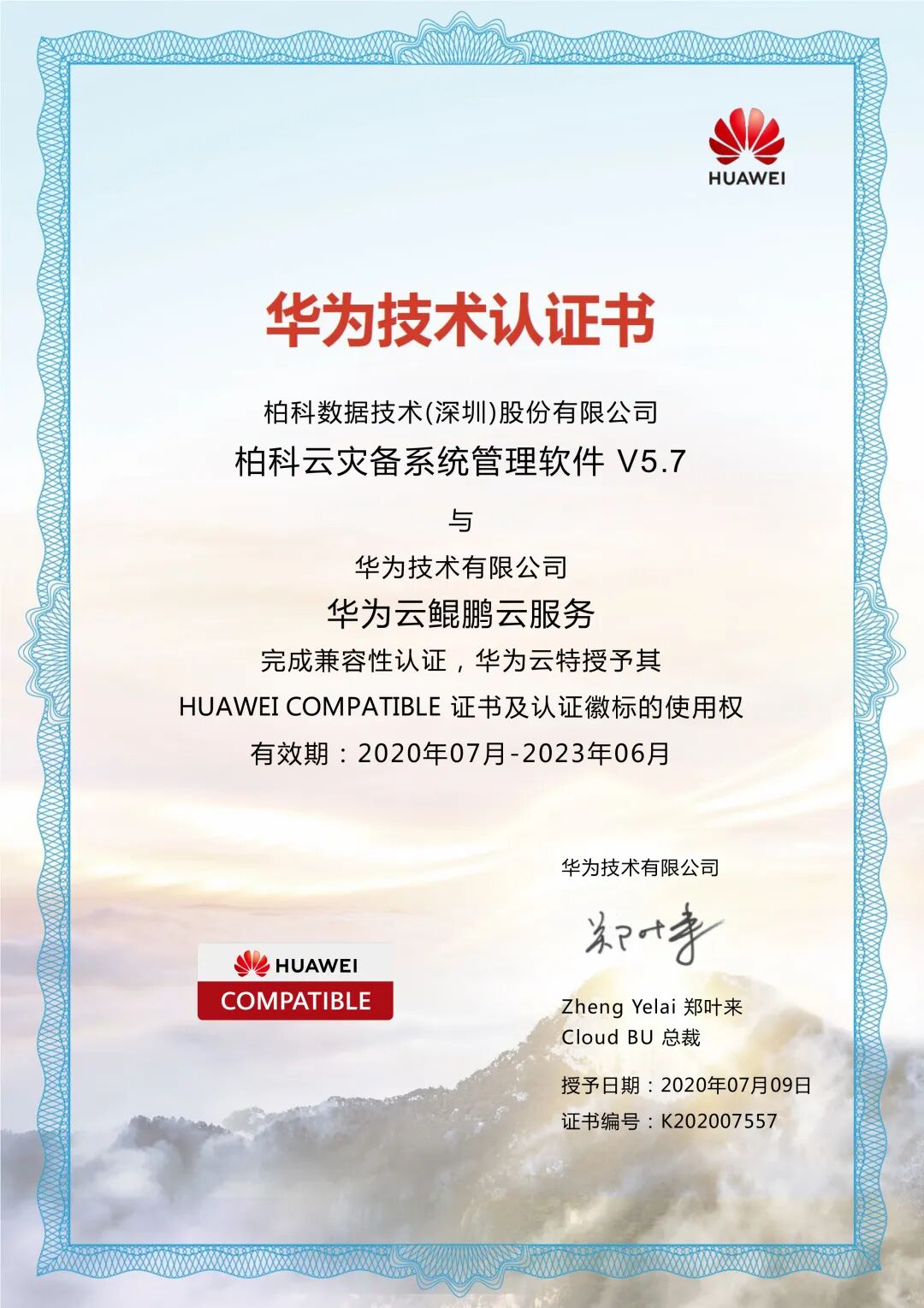 ▲柏科云灾备系统管理软件 V5.7与华为云鲲鹏云服务产品兼容性互认证证书